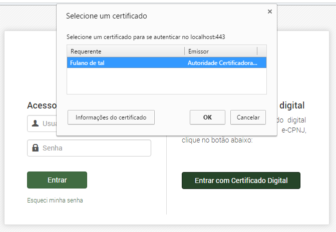 Importante: Se ao clicar no botão "Entrar com certificado digital", a janela de seleção de certificados do navegador não aparecer, você receberá a mensagem "Você não possui um certificado do tipo ICP Brasil ou clicou no botão cancelar na janela de seleção de cetificado"; isto é um indicativo de que o certificado não está corretamente instalado ou não é válido. Neste caso, entre em contato com o provedor do certificado para verificar sua validade.